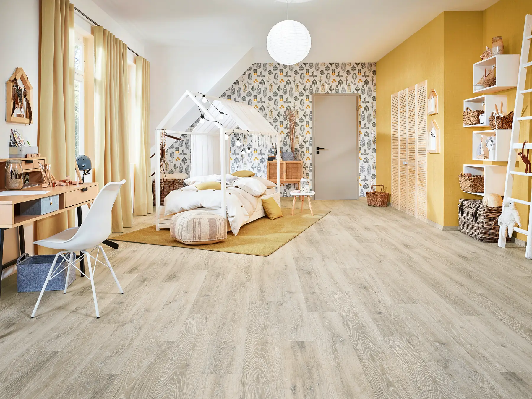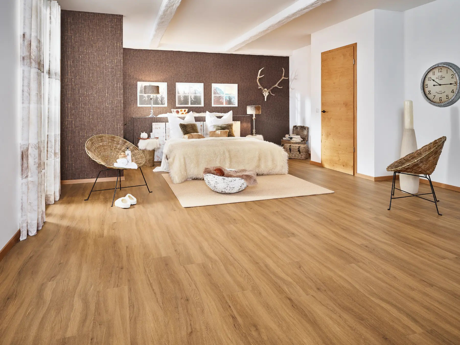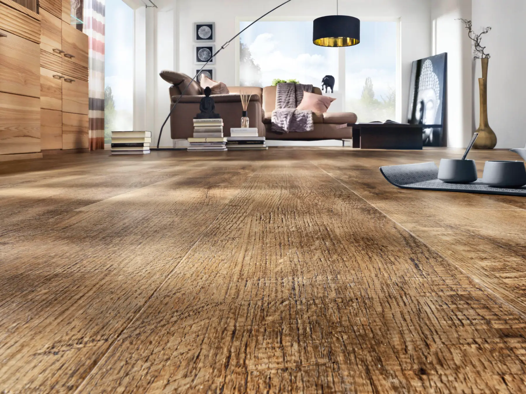 Laminat bietet eine robuste Oberfläche und eine große Auswahl an Holzoptiken. Damit eignet es sich gut für viele Wohnbereiche.